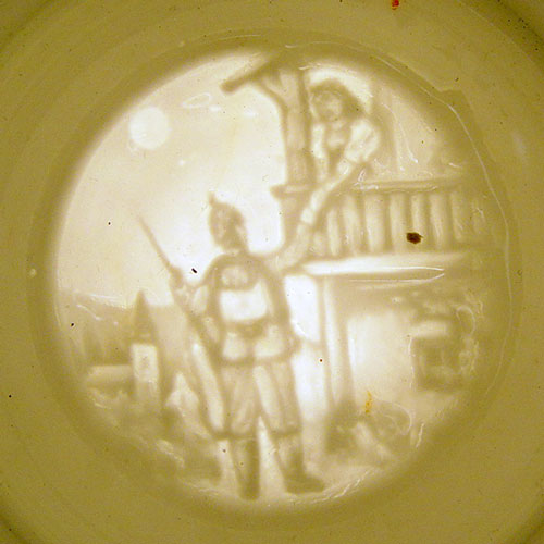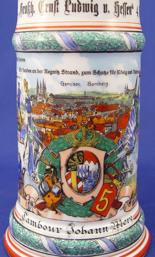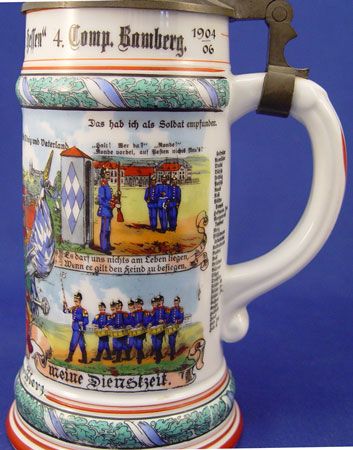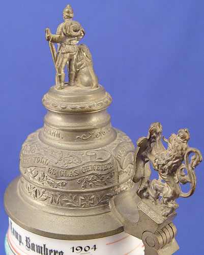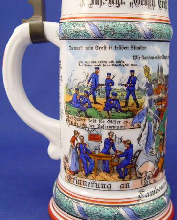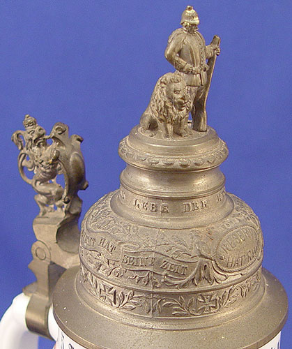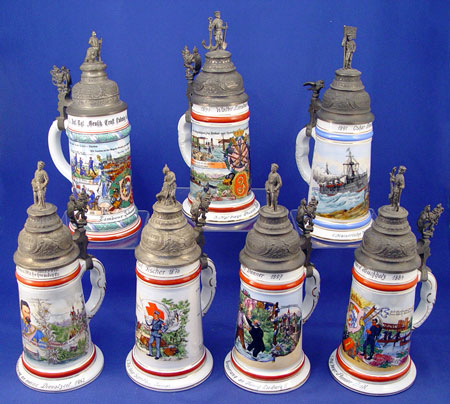 7 REGIMENTAL STYLE LITHOPHANE GERMAN STEINS: Series of 7 steins with assorted military scenes, each different. Smelter figural tops also different on each. All tops marked ''Reserve Hat Ruh'', '' Der true gedient hat shine zeit dem sei ein volles glas gewright''. 11 1/2'' tall overall, 4 5/8'' base dia., 2 7/8'' rim dia.