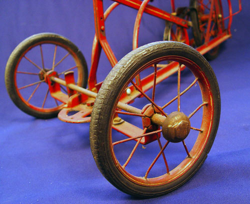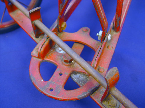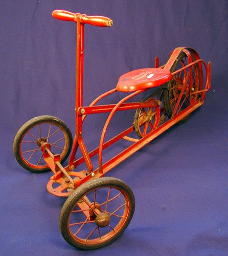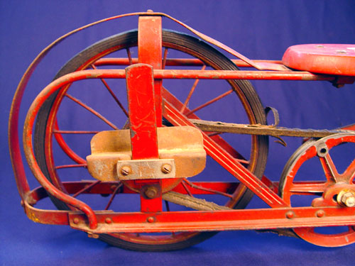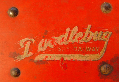 VINTAGE DOODLE BUG CHILDS PEDAL / PUMP CAR: Childs riding toy, belt drive. All original including tires & belt. shows use. Original paint decal reads ''Doodle Bug Spe-da-way Beckley-Ralston, Chicago''. 37'' long X 19'' wide at front X 21'' tot top of pump handle.