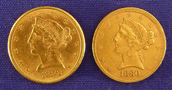 LOT OF 2 US 5 DOLLAR LIBERTY GOLD COINS: Two US 5 dollar Liberty gold coins. Dated 1880 & 1882.