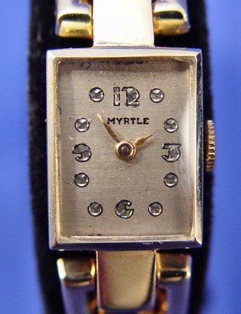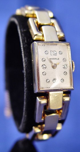 LADIES 14K WRIST WATCH: Dial marked MYRTLE, Swiss DREFFA WATCH CO 17 jewel works, case marked 14k to outside and 246606 inside back, chunky link bracelet, without works 19 grams, with works 22.5 grams, approx. 7''. All clocks and watches are sold as is, due to their delicate nature, even though they may be working just fine.