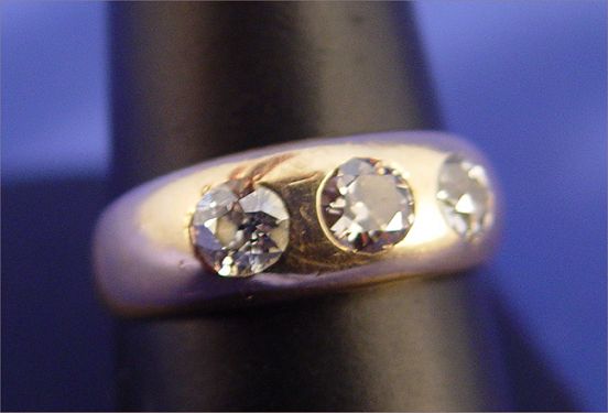 14K GOLD 1.00 CTW DIAMOND RING: Three old European round cut diamonds. TOTAL WEIGHT: 1.00 Ct. Approx. Rated VS1-VS2 in clarity and K-L in color. The diamonds are gypsy set. Weight: 6.2 grams. Circa: 1910-1930.