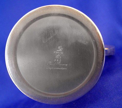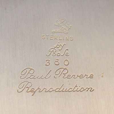 PAUL REVERE REPRODUCTION STERLING SILVER PITCHER: 7'' tall, 4 1/2'' top dia., 4 1/4'' bas dia. approx 22.45 troy oz. Marked on bottom ''Sterling by Poole 360 Paul Revere Reproduction''.
