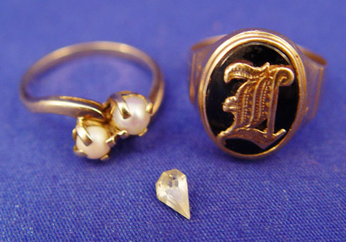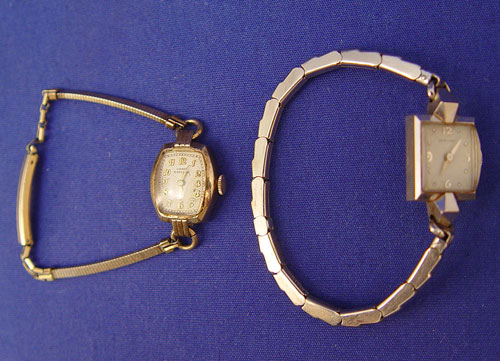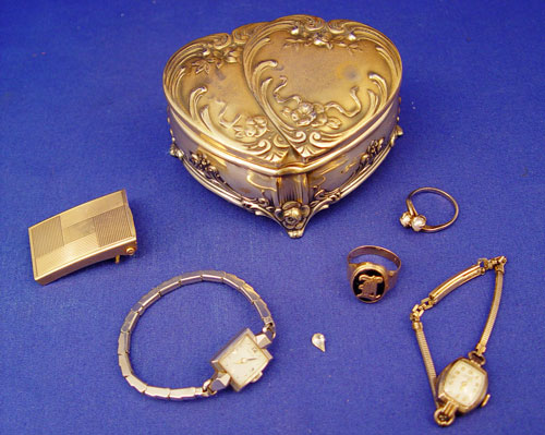 JEWELRY BOX-HEART SHAPE W/GOLD includes LOT OF 14K WATCHES, 14K & 10K RINGS & 14K BELT BUCKLE: 14K yellow gold ladies Girad Perregaux wristwatch with 12K gold filled bracelet. Cushion shaped case with applied Arabic markers. The case is inscribed: To Mickey. Love George. 12/25/43. Some foxing on dial. Jeweled movement. The watch is not running. 14K white gold ladies Hamilton wristwatch with 10K gold filled Speidel bracelet. Rectangle shaped case with applied Arabic and ball markers. The case is inscribed: Virginia C. Brennan, commemorating 25 years of loyal service to Harper & Brothers 1935-1960. Some foxing on dial. Jeweled movement. The watch is running. 10K yellow gold man's initial ring. Oval black onyx tablet with applied old English initial ''J'' Size 9 ½ Weight: 4.2 grams. 14K yellow gold ladies cultured pearl ring. 4.50 mm pearls, cream in color. Medium luster. Bypass design. Size 8 ½ Weight: 3.1 grams. 14K yellow gold belt buckle. Approx. 1 x 1 _'' Lined design with space of