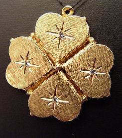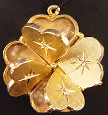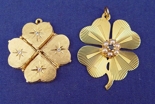 TWO GOLD SHAMROCK CHARMS: 14K yellow gold shamrock charm with six 2.50 mm cultured pearls and one .05 Ct. Sapphire. 1 1/4'' in diameter. 14K yellow gold shamrock locket charm with .15 Ct. white sapphires. Four individual lockets on the charm. 1'' in diameter. Weight: 19.4 grams. Circa: 1950-1960.