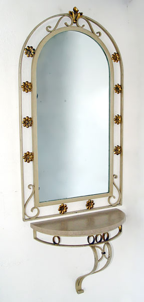 2 PART IRON & MARBLE CONSOLE SHELF WITH MIRROR: Metal frame with floral decoration, scrolling base support, demilune marble top, 57'' x 22''w. overall. Please note spotting in mirror.
