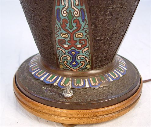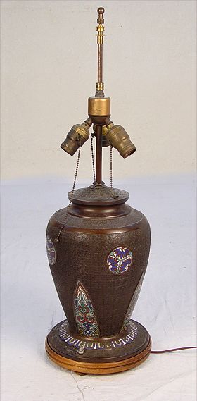 19th C CHINESE CHAMPLEVE LAMP: Hand chased body with four multi color rosettes and four cathedral shaped panels, unusual enameled skirted base, three pull chain sockets, 29''h. overall.