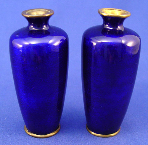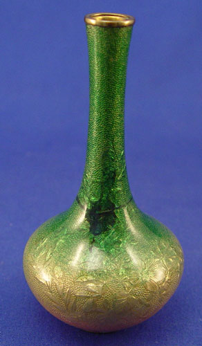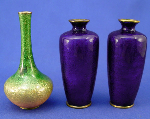 LOT OF 3 IMPORTANT ARTIST SIGNED MINIATURE CLOISONNE VASES: Ginbari cloisonne vases, two are blue 4 3/4'', and the other green to gold with an embossed floral under glaze motif, 5 1/4''.