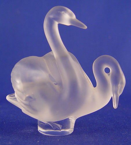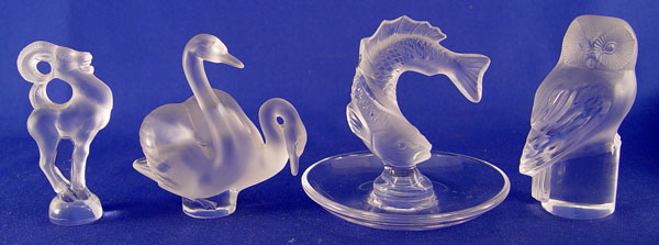 3 LALIQUE FRENCH CRYSTAL FIGURES: Lot of 4 pieces to include 1) ''Leaping Fish'' ring dish 3 1/2'' tall, dish 3 3/4'' dia., signed Lalique France, 2)''Owl'' paperweight 3 1/2'' tall, signed Lalique France, 3) ''2 Swans'' paperweight 3 1/2'' tall, signed Lalique France. Also included is 4) Crystal ram, 3 1/4'' tall illegible signature.
