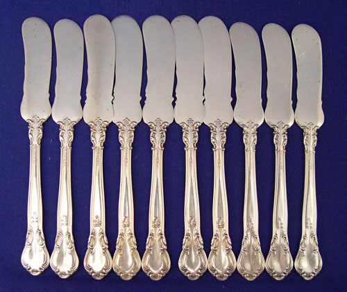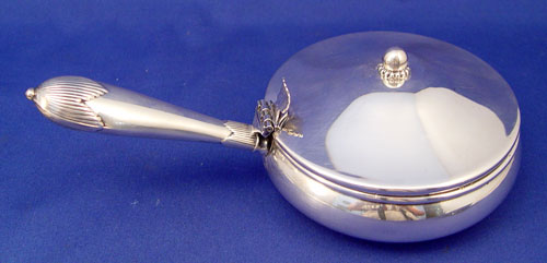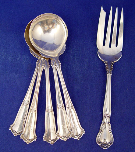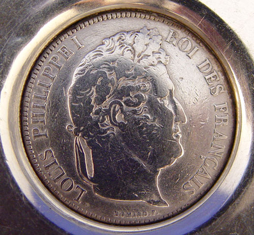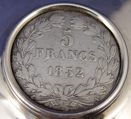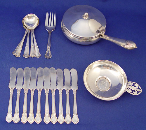 TRAY LOT OF STERLING SILVER INCLUDES CARTIER PORRIDGER: The porridger measures 5 3/4'' dia. and is set with an 1832 Five Franc coin; five Richard Wallace soup spoons; ten Gorham butter knives and a meat fork in the Chantilly pattern; and a silent butler. Approx. 23.3 troy oz.