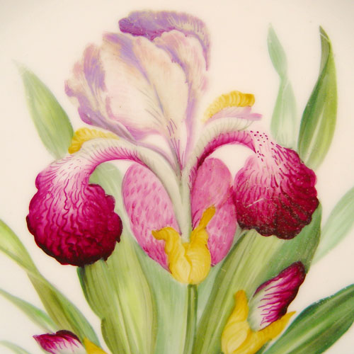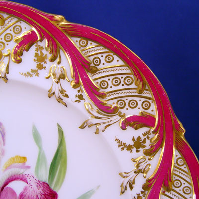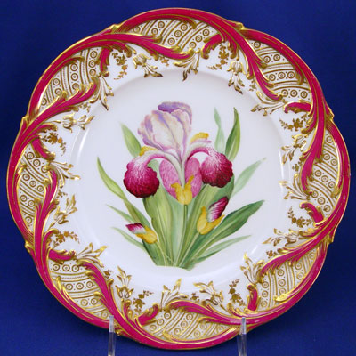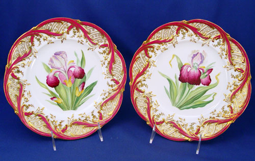 PAIR OF FINE ENGLISH ORCHID DECORATED CABINET PLATES: November 22, 1850 English registry mark. Hand painted orchid framed in a raised design border. Each center has a slight variation. 9 1/2''.