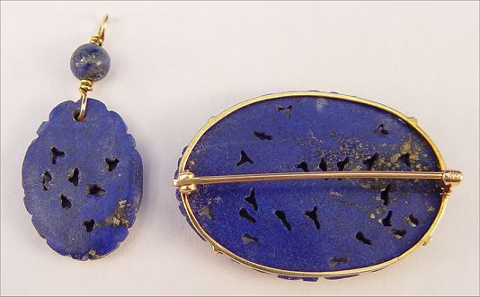 LAPIS LAZULI BRACELET: 18K yellow gold link bracelet with (4) four sided 10.00 x 10.00 mm cabochon cut pieces of lapis lazuli. Violet blue with pyrite and calcite inclusions. The lapis is bezel set. Link chain with 14k yellow gold lobster claw clasp (replacement). 7 1/2'' Weight: 20.8 grams. Circa: 1950-1960 14k yellow gold pendant with one 20.00 x 16.00mm oval piece of carved/pierced lapis lazuli with one 5.00 mm lapis lazuli bead. 14K yellow gold brooch frame with 35.00 x 25.00 mm oval shaped piece of carved/pierced lapis lazuli. Bar pin closure. Sold as a lot.