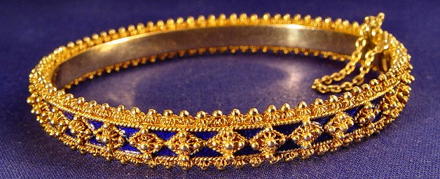 COBALT BLUE ENAMEL ETRUSCAN STYLE BANGLE BRACELET: 14k yellow gold Etruscan style bangle bracelet with cobalt blue enamel. Safety chain attached. 2 2/8'' x 2'', 17.5 grams.