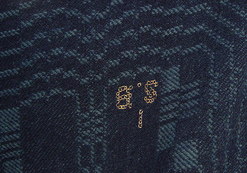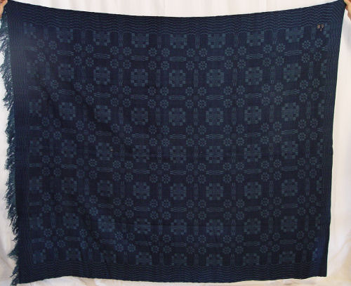 19TH C BLUE ON BLUE JACQUARD COVERLET: Repeating geometric design, light and dark blue. Approx. 73'' x 89''.
