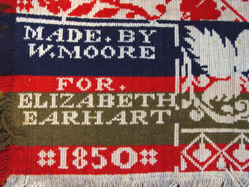 SIGNED AND DATED 1850 WOVEN JACQUARD COVERLET: Signed in the weave of the textile '' Made by W. Moore for Elizabeth Earhart 1850''. Four colors, Approx. 85'' x 78''.