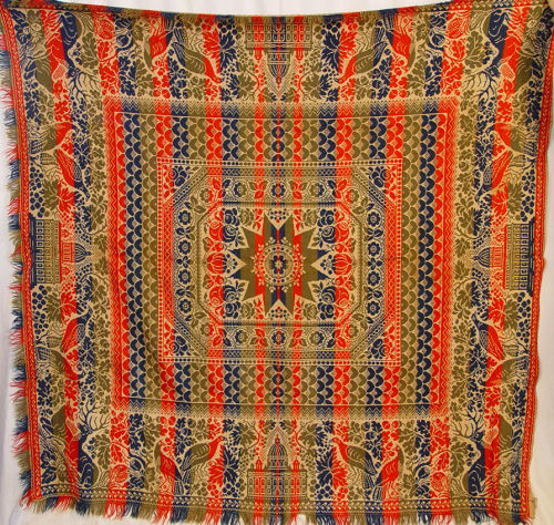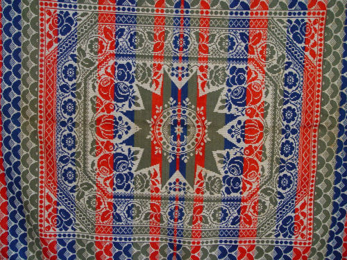 CAPITAL AND BIRDS WOVEN JACQUARD COVERLET: Center medallion with birds and capital border, deer at each of the corners. Approx. 79'' x 81''.