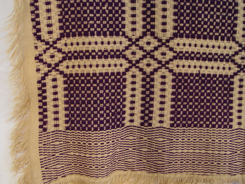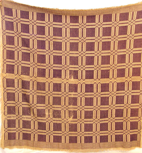 19th C JACQUARD COVERLET: Two color, purple and cream. Minor moth damage. Approx. 75'' x 75''.