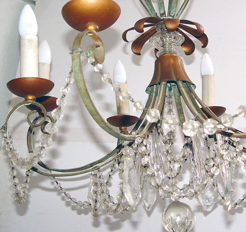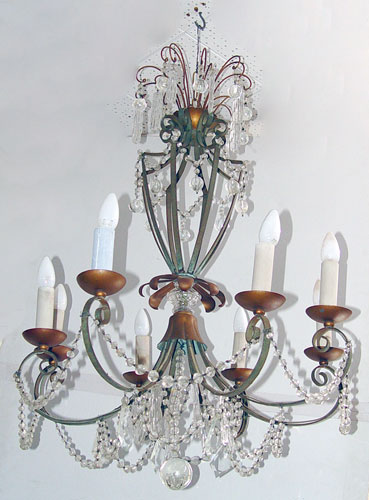 ITALIAN METAL AND CRYSTAL PRISM CHANDELIER: Eight lights on scrolling arms, graduated faceted prism chains, prism bars and balls, 36''h. x 24''dia.