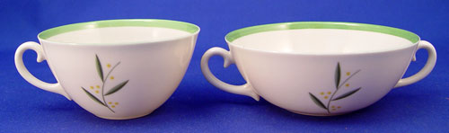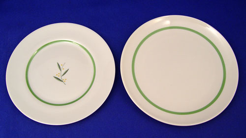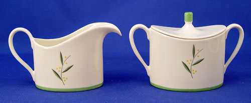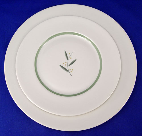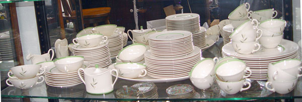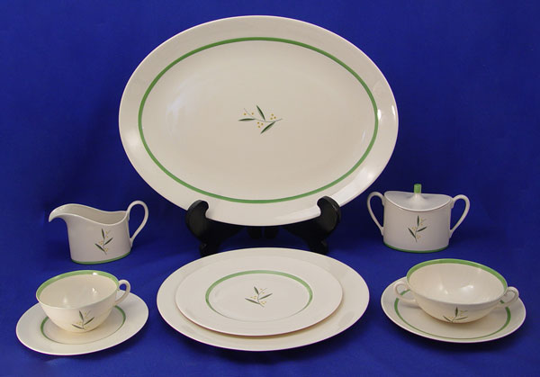 FRANCISCAN ''WESTWOOD'' FINE CHINA SERVICE: 80 piece service for 12 to include 12 dinner plates (10 1/2'' dia.), 12 salad plates, 12 bread plates, 14 cups, 14 saucers (one chip), 8 cream spoons, 8 underplates, 1 covered sugar, 1 cream pitcher, and a 16'' platter. California Franciscan.