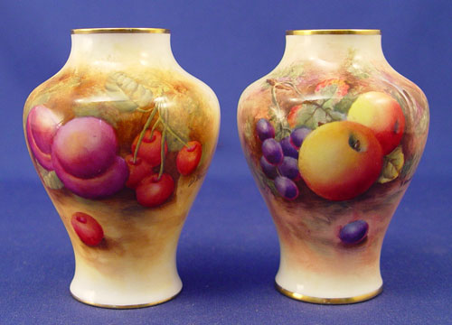 ROYAL WORCESTER ARTIST SIGNED VASES: Signed by ''D. Bowkett'' (David), painted in a fruit motif, 1950 W date mark. 4'' tall.
