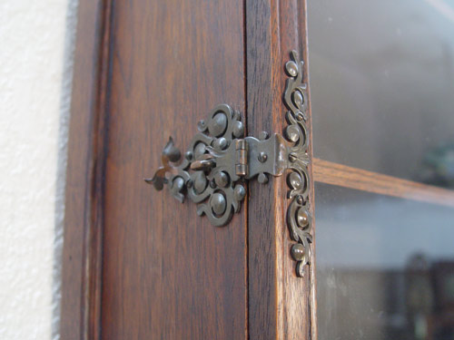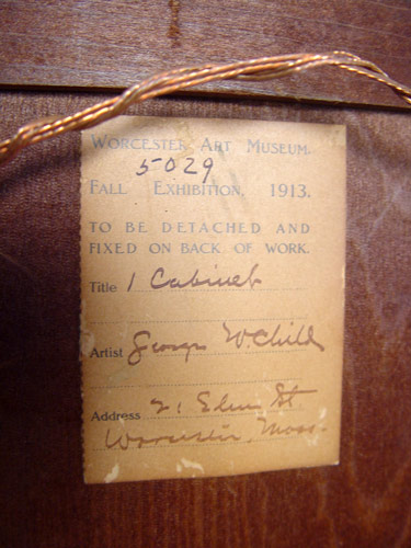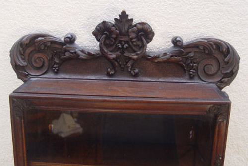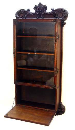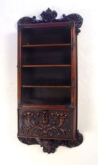 1913 MASSACHUSETTS CARVED SHAVING MUG CABINET: Built by George Child, Worcester Mass. as stated on the Worcester Art Museum 1913 fall exhibition label on the back. Wall mount display cabinet featuring a winged angel across the base. Glass front door, 4 shelf interior, hidden storage behind the fall front panel. 39''h. x 19'' x 5 1/4'' deep overall. The shelves are 4 3/4'' h. Mixed wood, predominate is walnut.