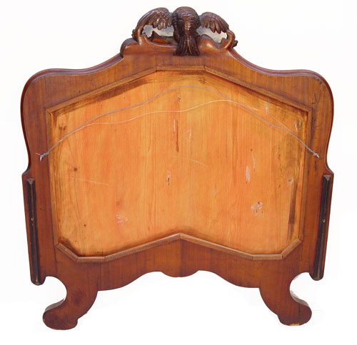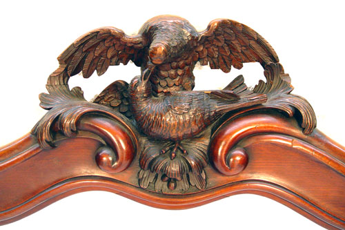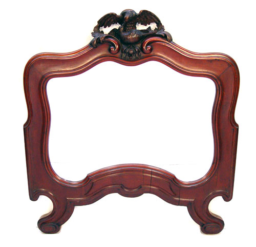 CARVED MAHOGANY LOVE BIRD CARVED MIRROR: Shaped frame with crest of doves or lovebirds. 46''h. x 42 1/2''w.