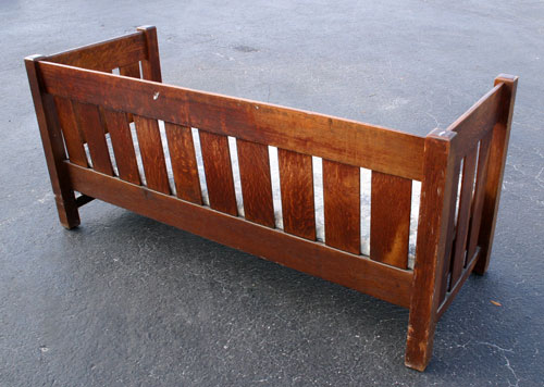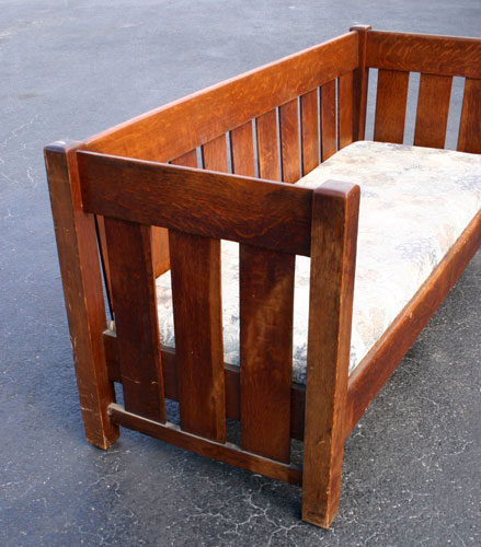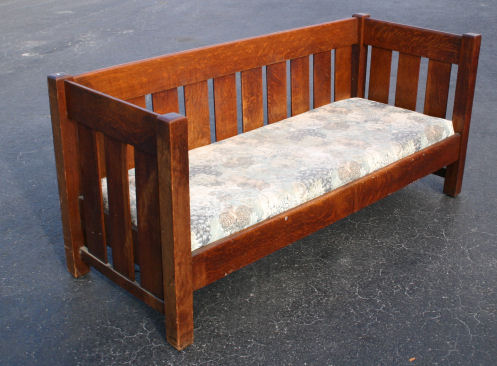 PERIOD ARTS & CRAFTS OAK EVEN ARM SETTLE: 10 slats across the back, 3 on the sides. Recessed seat with replaced upholstery. 32''h. x 72''l. x 27 3/4'' deep.