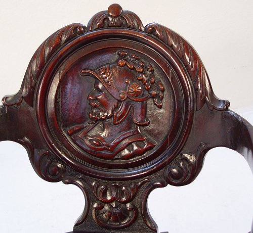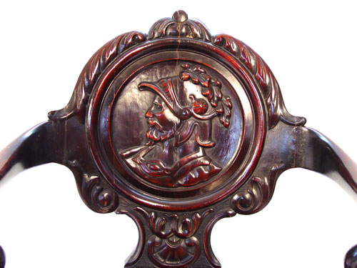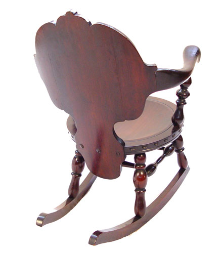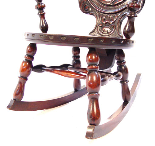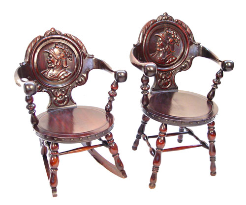 BLACK FORREST CARVED MAHOGANY ROCKER & CHAIR: Rocker is 33 1/4'' h. overall, seat 18'' d with the rockers being 30 1/4'' length. Chair is 37 1/4'', seat 18'' d. Both rocker & chair are 24'' w. overall.