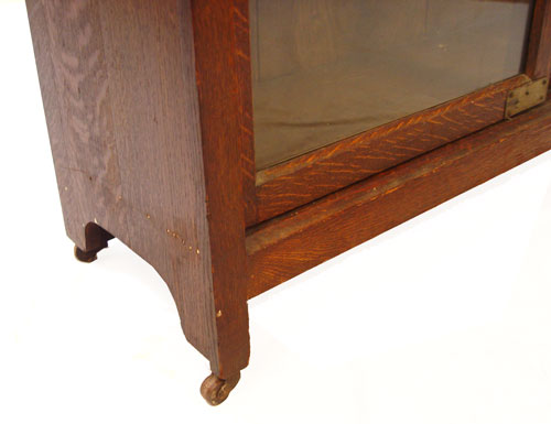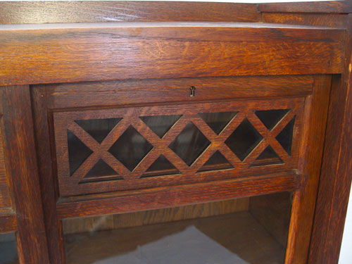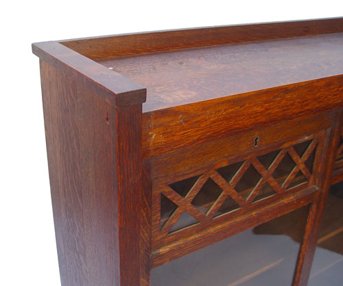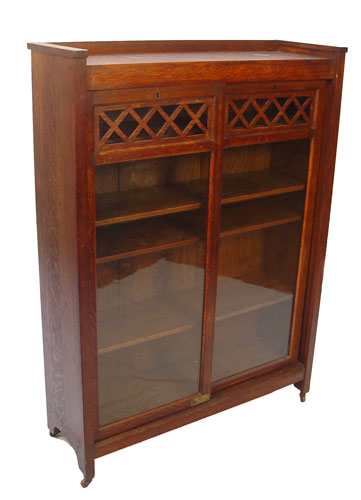 PERIOD ARTS & CRAFTS OAK BOOKCASE: With lattice panel at top of double glass doors. 55''h. X 39 3/4''w. X 13'' deep.