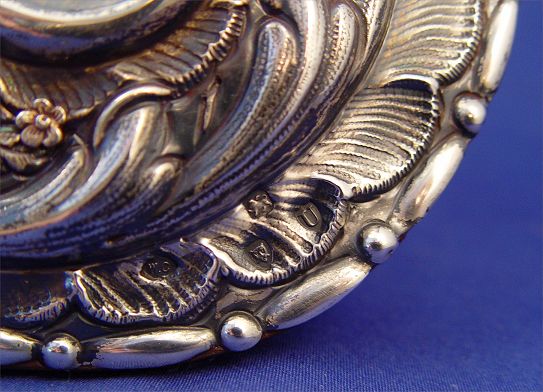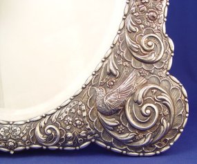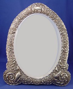 REPOUSSE STERLING FRAMED EASEL BACK MIRROR: Bears hallmarks for London, maker W.C. Beveled glass, 23''h. x 19''.