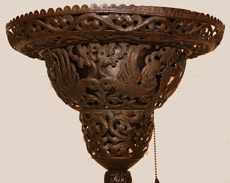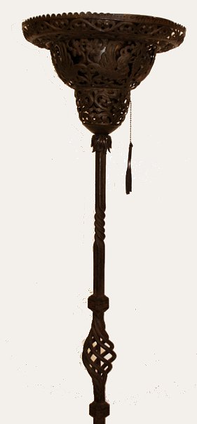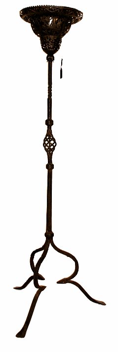 1920's MIZNER QUALITY WROUGHT IRON TORCHIERE LAMP: Dramatic spiral base and tripod legs support a reticulated shade with metal liner. Single pull chain. 68''h., the shade is 14 1/2'' dia., the legs spread 25''. Reportedly purchased from a local museum sale several decades ago; Museum ID tag still affixed to base.