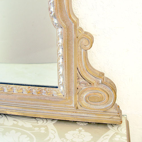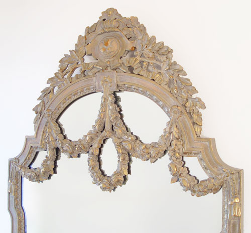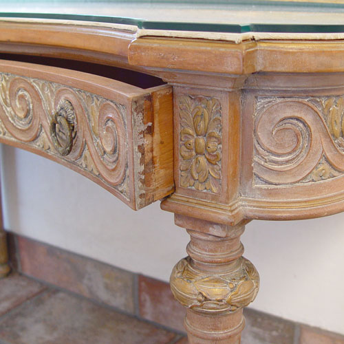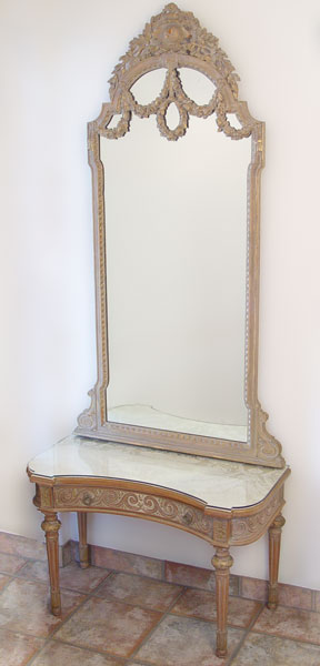 FRENCH DRESSING MIRROR AND TABLE: Early 20th C. Mirror with highly detailed carved floral swags, 60 1/4' tall x 32 1/2'', The low table has a full length drawer and is protected with a glass top. 33 3/4'' w. x 22'' h.