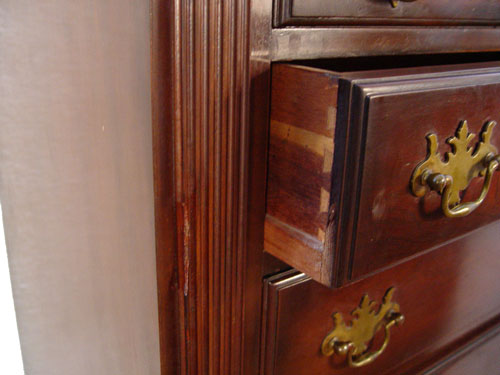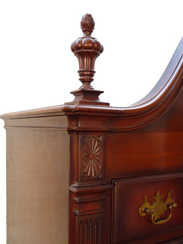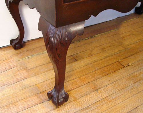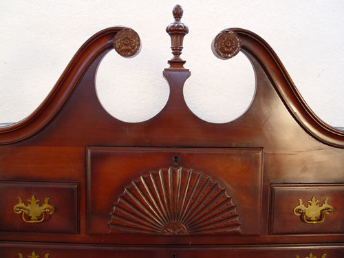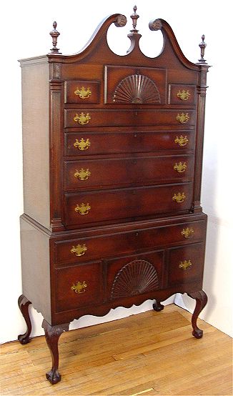 CHIPPENDALE STYLE BONNET TOP HIGHBOY: Mahogany high chest of 9 drawers. Top section with seven drawers, lower section has two full length drawers. Fan and rosette carvings, acanthus leaf cabriole legs ending in ball and claw feet. Valenced skirt. 6'1/2'' tall, x 44 1/4'' x 19 1/2''.