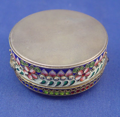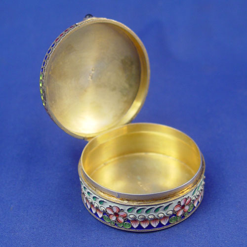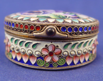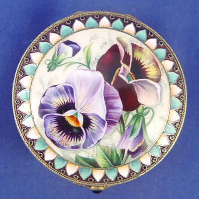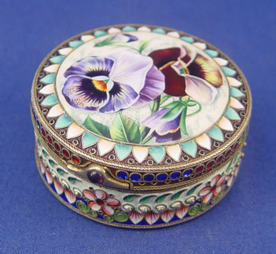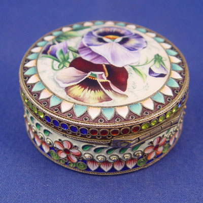 RUSSIAN ENAMELED SILVER BOX WITH PANSY COVER: Moscow, ca. 1908-1917, maker Artel. Vermeil interior, hinged lid with amethyst cabochon, 7/8''h. 2 1/4'' dia. Hallmarked on the interior of lid and base.