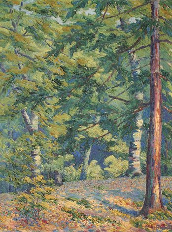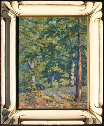 GOOD IMPRESSIONIST FOREST LANDSCAPE PAINTING CIRCA 1930: Oil/C, 24'' x 18'', illegibly signed, period carved and painted frame, 31 1/2'' x 26''. Several areas of paint fleck, thinning canvas. Est. $800/1200**