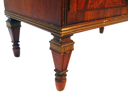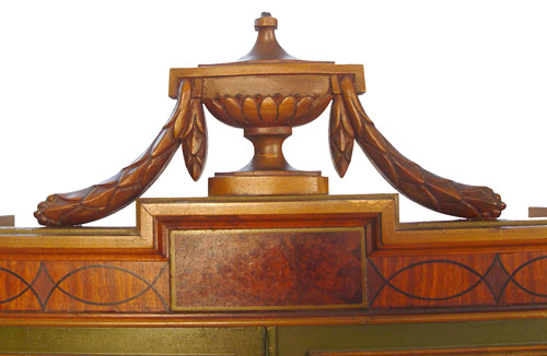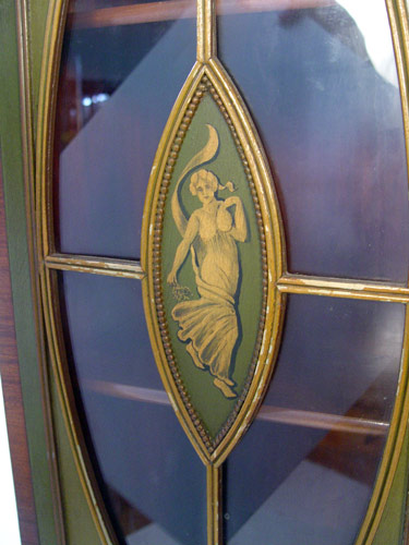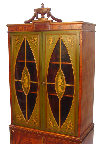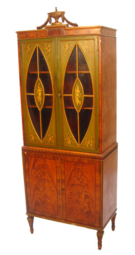PAINT DECORATED CHINA CABINET BOOK CASE BY ADAMS: Upper section with painted decorated glass doors opening to two wooden shelves, over two solid door base with lovely flame veneer to fronts, raised on baluster feet, all topped by urn and swag crest. 73''h., 27 1/2''w. x 14 3/4''d.