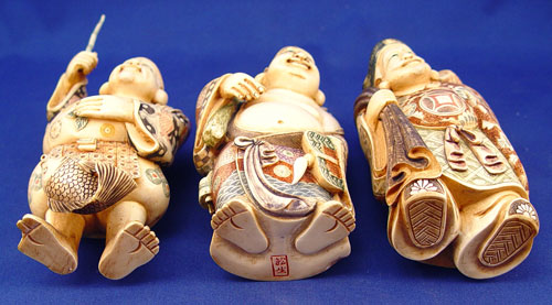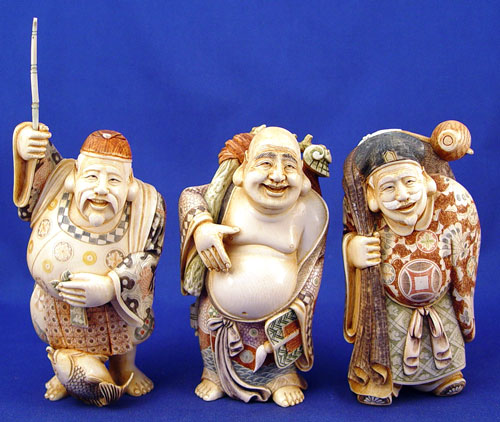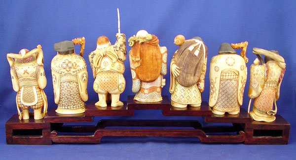 SET OF 7 CARVED IVORY FIGURES: Seven immortals displayed on a wooden bridge. 3 of the figures are signed. Ivory is approx. 6 1/2''h. Wood stand approx. 24''l.
