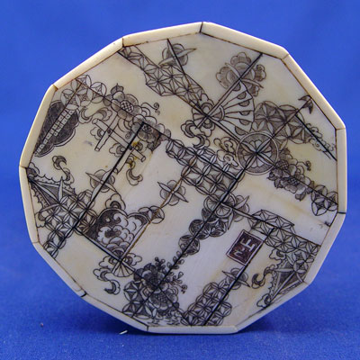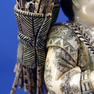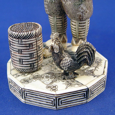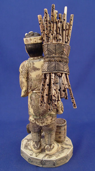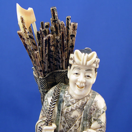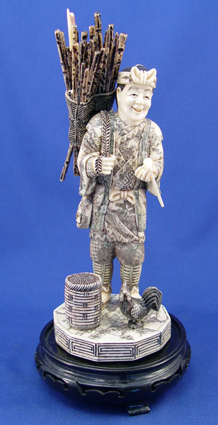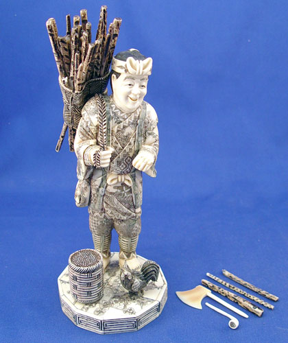 JAPANESE CARVED IVORY WOOD SELLER: With basket of firewood and ax, 10 3/4''.