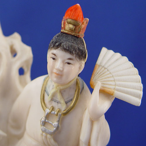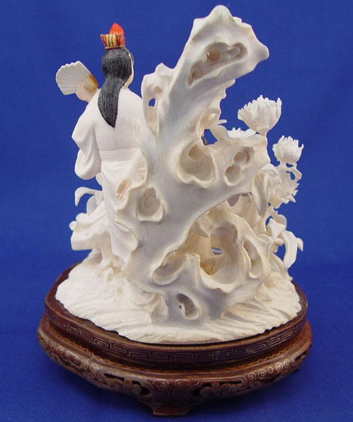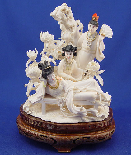 CARVED IVORY FIGURAL GROUP 3 GEISHA: Adhered to wood base, detailed grouping with Geisha and flowers. Ivory is 6 3/4''.