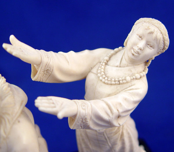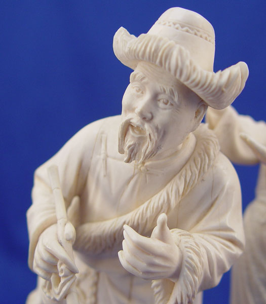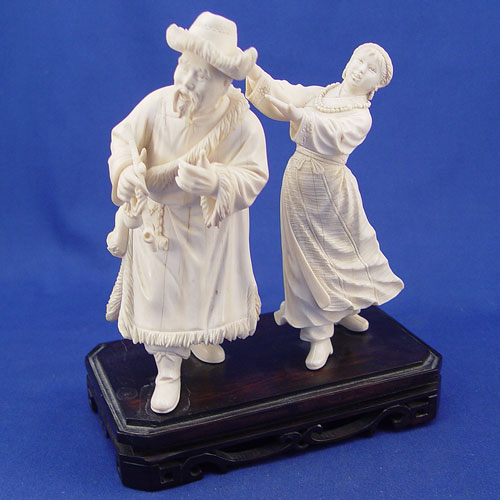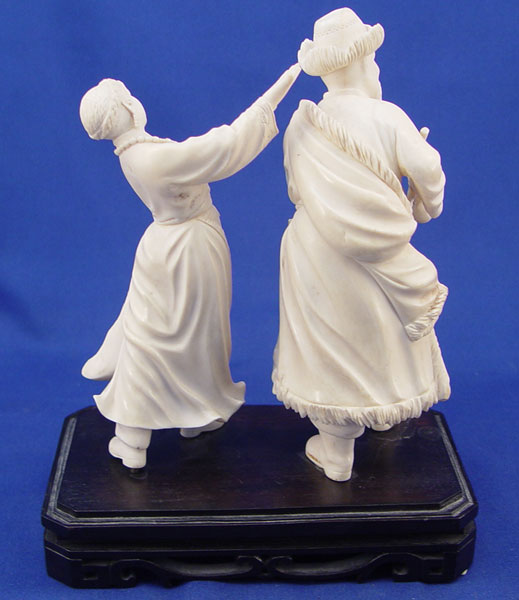 CARVED IVORY FIGURES MONGOLIAN MAN AND WOMAN: Two separate figures on single wooden stand. Ivory is approx. 7''h.