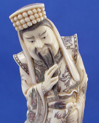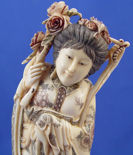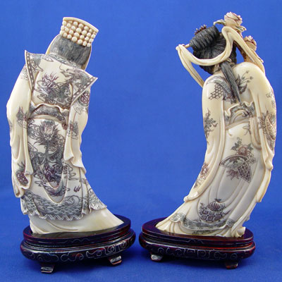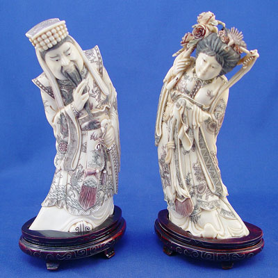 CARVED IVORY MAN AND WOMAN FIGURES: Each carved from a tusk, signed, 8 1/2''h.