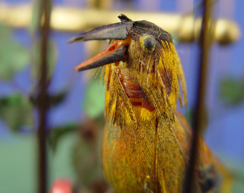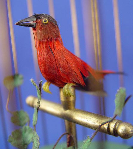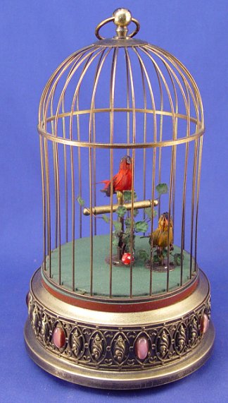 2 BIRD SINGING AUTOMATON: Animated red and yellow birds ''sing'' with a wind of the key. Ornate cage set with stones. 11''h., the 6 7/8'' dia. We have heard it work, but seems to be temperamental. 11''h., 6 3/8'' dia.