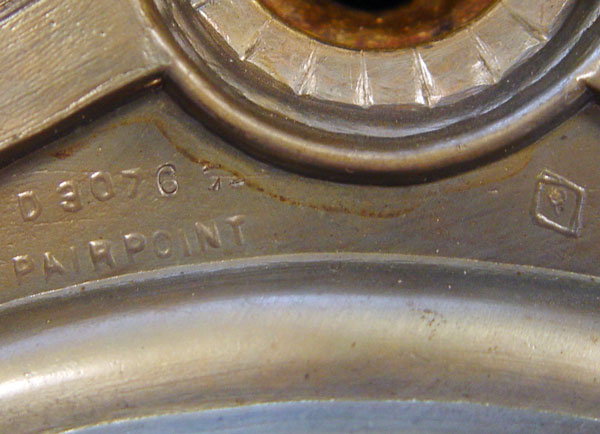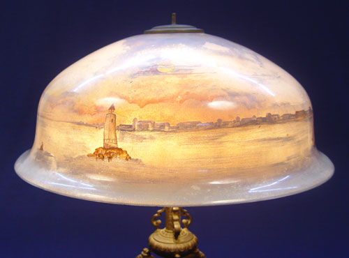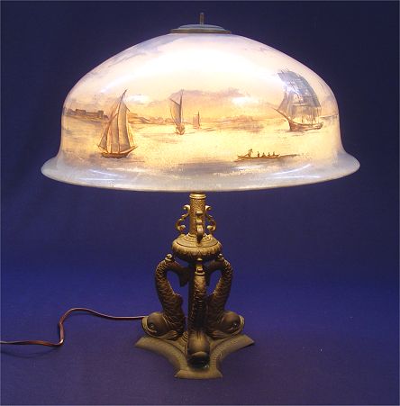 SIGNED PAIRPOINT LAMP NEW BEDFORD HARBOR REVERSE PAINTED SHADE: Signed triple fish base with original bronzed finish. The bell shaped shade is painted in a busy harbor scene. The interior has been recoated, probably to preserve the scene from further paint loss. The shade is 18'' dia., the lamp is 20''h. overall.