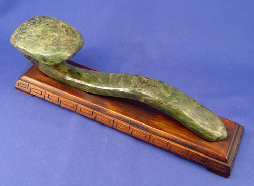 DARKEST GREEN CARVED JADE RUYI: On wooden display stand. An estate find, 13 1/2''l.
