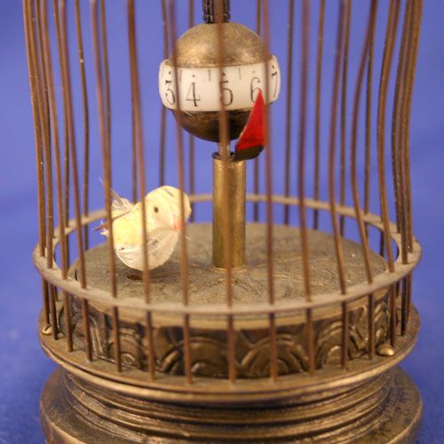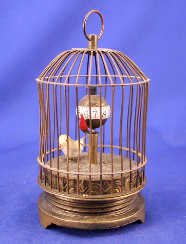 MINIATURE AUTOMATON SINGING BIRD CLOCK: The feathered bird figure moves back and forth in time with the ticks of the ball clock, brass cage, 4 1/2''h. x 2 3/4'' dia.