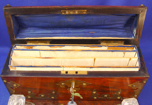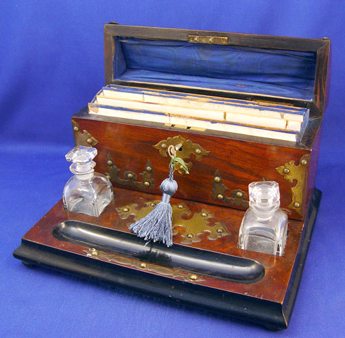 19th C LETTER BOX AND INK STAND: Richly grained, semi dome lift top covers the letter slots. A pair of glass ink bottles (one with damage), and pen well. Brass ornamentation. 7 1/4'' x 11 1/4'' x 9 1/2''.