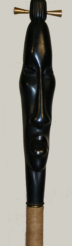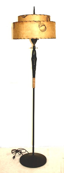 AFRICAN MOTIF 1950'S FLOOR LAMP: Iron base, original two layer shade. 61''h. The 15'' shade sits on milk glass cone shade.