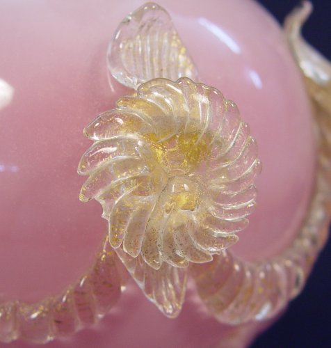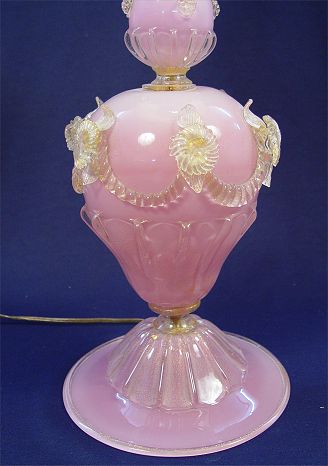 MURANO OR VENETIAN GLASS LAMP, PINK WITH AVENTURINE: Amazing pink glass with applied aventurine decoration. The glass is 23''h, the lamp including matching pink trim shade is 40''h. overall. Overall in very good condition, one flower and the top rim small issues.