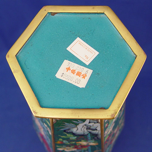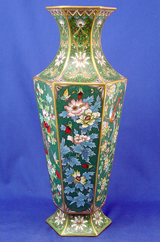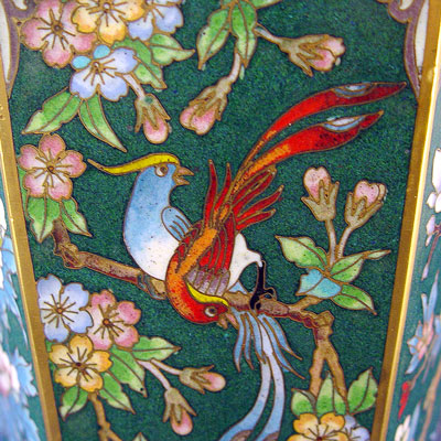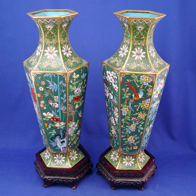 PAIR OF CLOISONNE VASES: Tall tapered hexagonal vases with flowers and birds, green ground, 15''h.