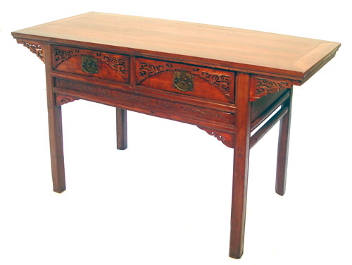 CARVED ORIENTAL ALTAR TABLE: 2 drawers across the apron. 36''h. x 61 1/2''l.