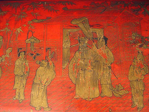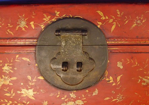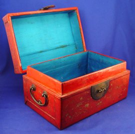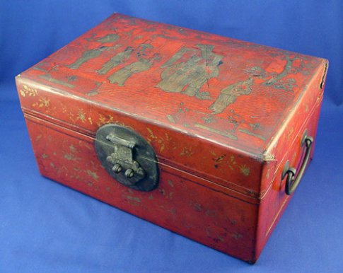 ORIENTAL LACQUERED BOX: Red lacquer with gold decoration. Appears to possibly be on leather, as the corners are folded. 7 1/2''h. x 15'' x 9 3/4''.